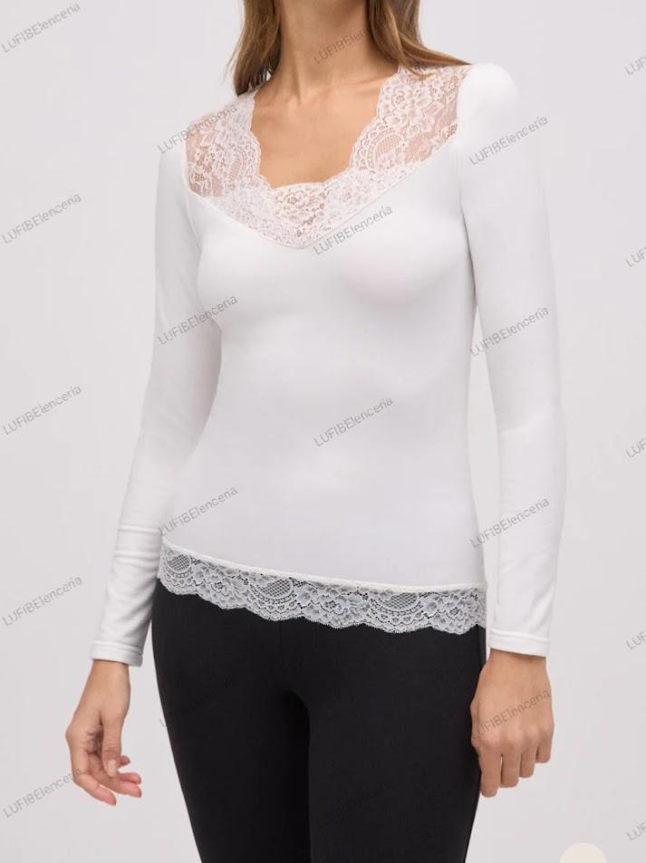 .Camiseta Termica manga larga con encaje Ysabel Mora. Camiseta de señora termal con manga larga. Interior Afelpado. 92% Poliéster, 8% Elastano 100% Poliester